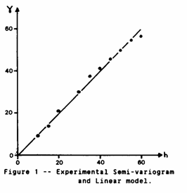A semi-variogram was constructed for this data and is shown in Figure 1. A simple Linear model has been fitted to the graph by eye, and is found to have a slope of 1.00. There is no apparent nugget effect. The cross validation procedure was applied to this data set resulting in a set of "Z" statistics which had an average of 0.006 and a standard deviation of 0.907. The constant standard error, i.e. for points other than those around the edge, was 2.777%Fe.