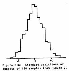 Rather than do this once and risk hitting an extreme value, the process was repeated 1,000 times and histograms constructed of the results. A subset size of 150 was chosen, Any other size could be chosen with little effect on the following results. Figure 3 shows the histograms of (a) the average Z statistic for the set of 150 samples and (b) the standard deviation of the sets of 150. Both of these histograms show no deviation from Normality. The average values of the subsets vary around the overall average, and range between -0.22 and +0.26. The standard deviations range from 0.74 to 1.05 and average 0.902.