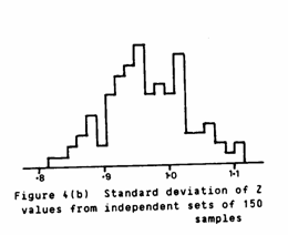 Similarly Figures 3(b) and 4(b) show the standard deviations of the Z statistics in each case. Visual comparison of these graphs should be rewarding. It should be borne in mind, however, that Figure 3 is based on 1,000 subsets and Figure 4 on only 100. The lumpy nature of the histograms in Figure 4 is probably due to the small number of subsets. All four histograms give very good χ2 goodness of fit statistics when compared with a Normal distribution.