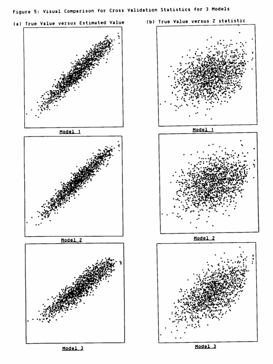 Three models have been fitted to the simulated taconite deposit and all of them produce acceptable cross validation statistics. We must look for some other way of comparing them before we can decide which is "best". Figure 5 illustrates a simple method of comparison, using scatter graphs of one quantity against another. Figure 5 shows (a) True Value (X axis) versus Estimated Value (Y axis) and (b) True value (X) versus Z statistic (Y) for each model. The value scale is 45%Fe to 92%Fe in each case and the scale for Z is -3.4 to 3.4.