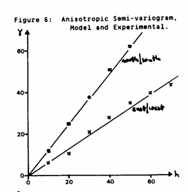 It is unusual, at least for this author, to judge the fit of a semivariogram without seeing experimental and model curves on the same graph. Figure 6 shows the experimental semi-variogram and Model 2 for visual comparison. It can be seen from Figure 6 that the deposit under study is, in fact, not isotropic. Only two directions are shown, these being the major axes of the anisotropy. The models for these directions are Linear with slopes 0.66%Fe2 /m and 1.25%Fe2/m. Intermediate directions have intermediate slopes varying in an ellipsoidal fashion. The cross validation procedure was unable to distinguish between an incorrectly fitted isotropic model and the "correct" anisotropic model.