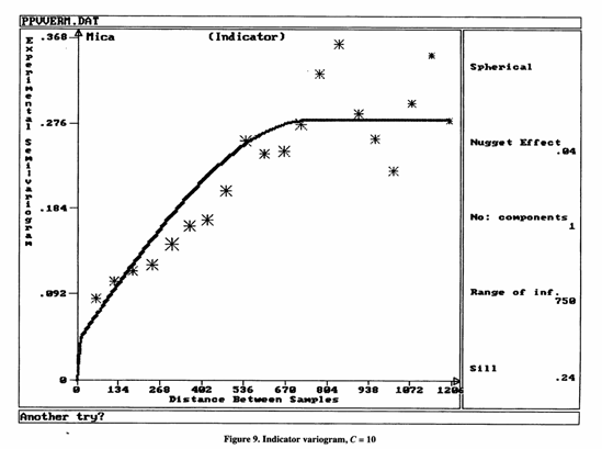 In the study described here, the indicator cut-off values were taken as C1 = 10 and C2 = 25. This was after the application of the rule-of-thumb method in which indicators are chosen so that the data retained are not less than three times the number of cut-off grades selected[?ref?], as well as the use of the point on the probability plot where there is a distinct turn on the graph. The Geostokos Toolkit also makes it possible to experiment with different cut-off grades to find one that gives a set of useful, easy-to-model semivariograms.